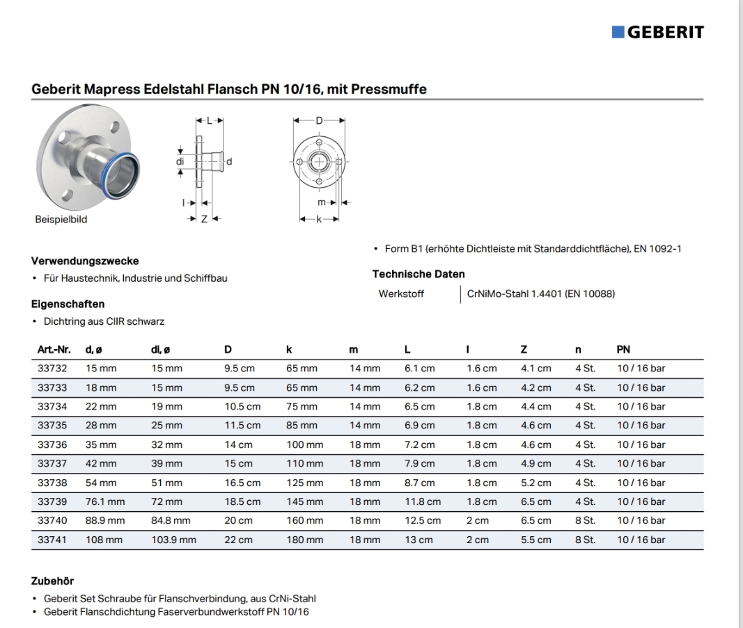 Geberit Mapress Edelstahl Flansch PN 10/16 mit Pressmuffe